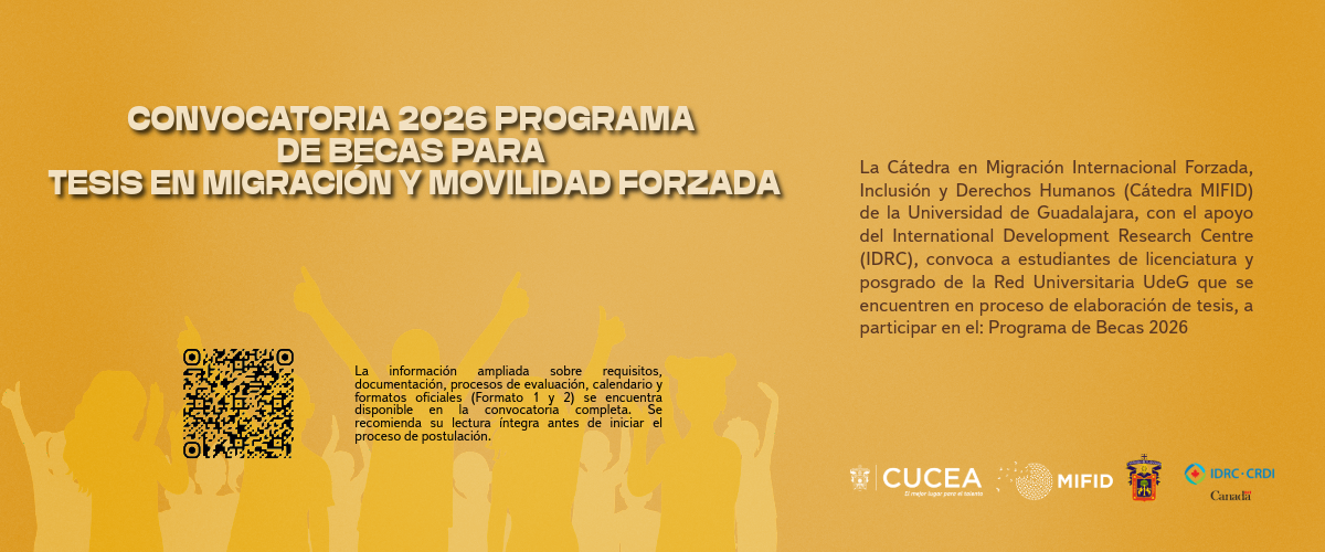 La Cátedra en Migración Internacional Forzada, Inclusión y Derechos Humanos (Cátedra MIFID) surge a partir de una subvención económica otorgada por el Centro Internacional de Investigaciones para el Desarrollo (IDRC) del gobierno de Canadá a partir del mes de marzo del año 2022. El apoyo al que se hizo acreedora la Universidad de Guadalajara por parte del IDRC forma parte del proyecto global de ese organismo titulado: “Fortaleciendo conocimiento, uso de la evidencia y liderazgo en el Sur Global sobre el desplazamiento forzado: México y América Central”.